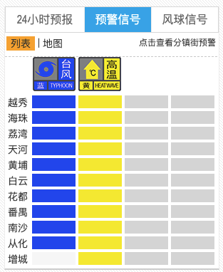 截至19日9时30分,广州11区发布高温黄色预警,多区发布台风蓝色预警。